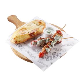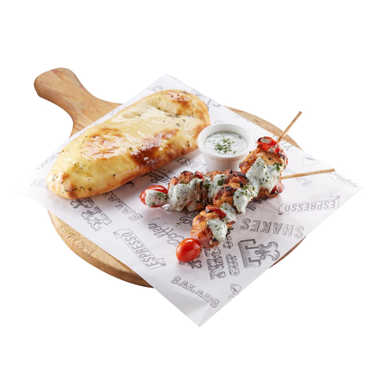 Tender Chunks of Chicken Marinated in Aromatic Eastern Spices such as Paprika and Cayenne and served with Grilled Healthy Veggies, Mint Yoghurt and Herb Butter Flatbread