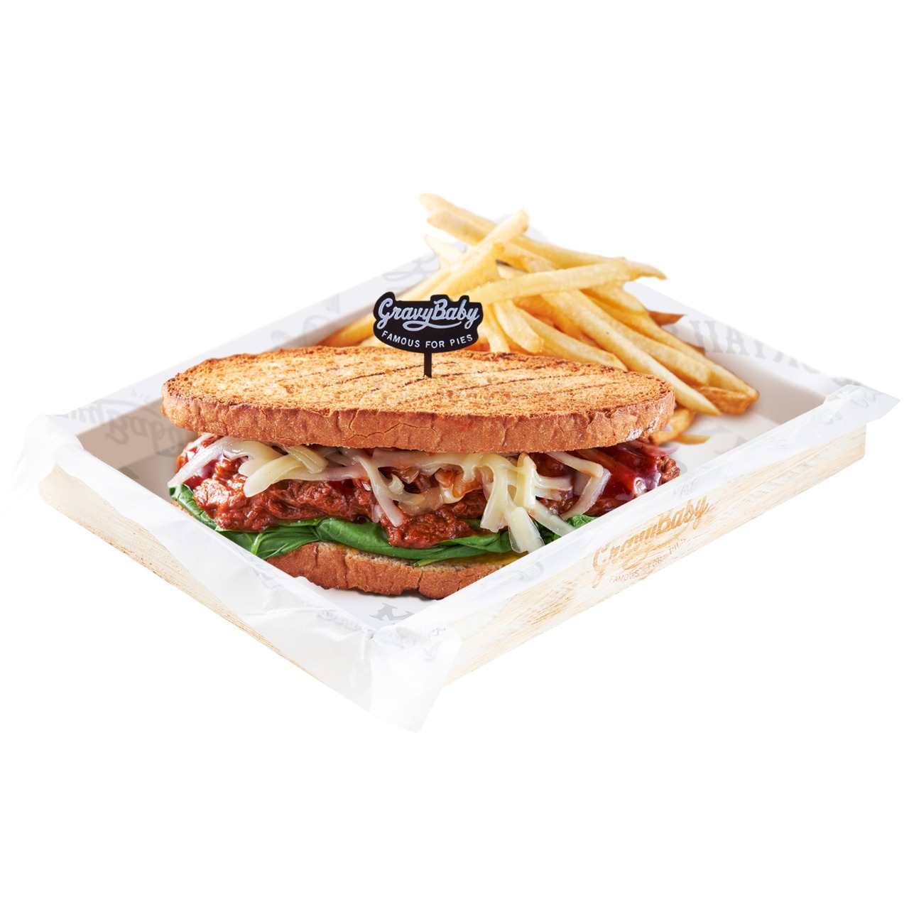 Soft and Succulent Slow Roast Pulled BBQ, Homemade Chili Aioli, Swiss Cheese, Red Onion and Spinach on Thick Chunky Soft White Bread
